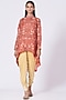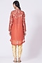 Featuring a red jacket in organza base with zardosi embroidery. It is paired with contrasting dhoti pants and a slip.