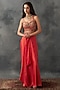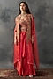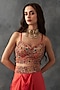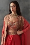 Featuring a rust cape in chanderi, organza and satin base with embroidery. It is paired with an embroidered bustier and a draped skirt. Style with polki earrings and heels for festive celebrations or sangeet ceremony.