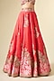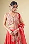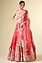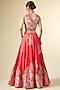 Featuring a saffron lehenga in shimmer brocade organza base. It is paired with a blouse and an ombre dupatta. Accentuate statement jewellery and heels for any festive occasion.