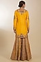 Featuring a yellow short kurta in chanderi base with hand and machine embroidery. It is paired with sharara pants and an organza dupatta. Accentuate it with kundan jhumkas and embroidered juttis for a stylish ensemble, ideal for festive occasions or haldi functions.