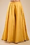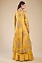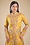 Featuring a yellow jacket in chanderi and organza base with hand and machine embroidery. It is paired with sharara pants and a slip. Accentuate it with statement earrings and block heels for haldi ceremonies.