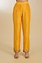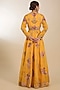 Featuring a yellow front open kalidar anarkali in organza base with velvet patchwork. It is paired with pants. Accentuate it with pearl drop earrings and embroidered wedges for a stylish ensemble, ideal for engagement ceremonies or haldi functions