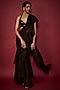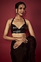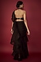 Featuring a black pre-draped ruffled saree in satin georgette base. It is paired with a sequin halter blouse. Accentuate with statement earrings and heels for a festive occasion or cocktail ceremony.