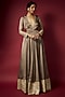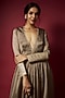 Featuring a dusty gold gown in recycled polyester base with sitara foil print and a deep V-neckline, including gota border detail. Accentuate with statement earrings and heels for sangeet ceremonies.