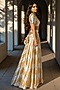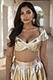 Featuring a gold lehenga in recycled polyester base with chevron pattern and gota embroidery. It is paired with an embroidered blouse. Accentuate it with metallic heels and statement earrings, perfect for a wedding, engagement party or sangeet night.
