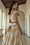Featuring a gold lehenga in recycled polyester base with chevron pattern and gota embroidery. It is paired with an embroidered blouse. Accentuate it with metallic heels and statement earrings, perfect for a wedding, engagement party or sangeet night.