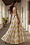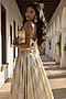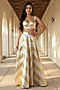 Featuring a gold lehenga in recycled polyester base with chevron pattern and gota embroidery. It is paired with an embroidered blouse. Accentuate it with metallic heels and statement earrings, perfect for a wedding, engagement party or sangeet night.