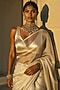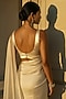 Featuring an off-white saree in satin base. It is paired with sleeveless blouse having a deep neck. Accentuate it with jewellery like a statement choker or chandelier earrings to elevate the look, slip into heels, and you are ready for weddings, cocktail nights or any event where you want classic style with a fresh attitude.