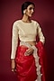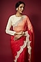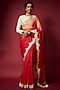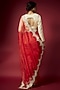 Featuring a red scalloped saree in organza base with mirror, pearl and zari work. It is paired with a recycled polyester gold shimmer blouse. Accentuate with statement earrings and heels for weddings or sangeet ceremonies.