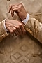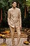 Featuring a beige asymmetrical overlap bandhgala in silk base with metal buttons and diamond embroidery. It is paired with cotton tussar trousers. Style it with mojaris for a reception, sangeet, wedding or engagement ceremony.