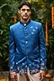 Featuring a blue bandhgala in mysore silk base with flora and bird embroidery. Style it with pants, mojaris for a reception, sangeet, wedding or engagement ceremony.