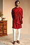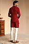 Featuring a crab red bundi jacket in wool base with half and half embroidery. Perfect for a festive occasion or wedding ceremony.