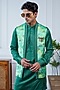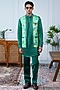 Featuring a green bundi jacket in linen satin base with chawal taka stitch detail, pockets and print. Style it with a kurta set and black mojaris for a festive occasion, destination wedding, mehendi or engagement ceremony.