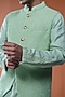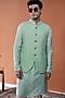 Featuring a mint green bundi jacket in silk base with geometric embroidery and golden buttons. Style it with a kurta set and kolhapuri sandals for a festive occasion, wedding, mehendi or engagement ceremony.