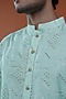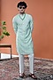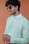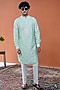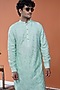 Featuring a mint kurta in silk base with golden pitta embroidery. Style it with pants and kolhapuri sandals for a festive occasion, mehendi or intimate pooja ceremony.