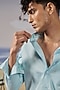 Featuring a pastel blue shirt in cotton base with a printed collar. Style it with grey striped pants or chinos for a sophisticated ensemble.