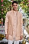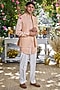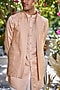 Featuring a peach bundi jacket in silk base with sequins embroidery. It is paired with a mysore silk kurta. Style it with pants, mojaris for a reception, sangeet, wedding or engagement ceremony.
