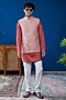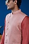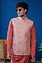 Featuring a salmon-colored bundi jacket in cotton tussar base with golden buttons and embroidery. It is paired with a kurta. Style it with pants and mojaris for a festive occasion, destination wedding or engagement ceremony.