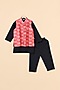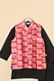 Featuring a red jacket for boys in silk base. It is paired with a black cotton kurta and pyjama pants. Accentuate it with pair of mojaris and a watch for a festive occasion, weddings or pooja ceremony.