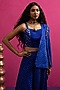 Featuring an electric blue bandhani cape in silk base. It is paired with flared pants and a corset. Accentuate it with polki jewellery and heels for festive occasions.