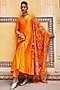 Featuring a kesariya angrakha in silk chanderi base. It is paired with pants and an organza dupatta. Style it with kundan jewellery and heels for a festive occasion, wedding, engagement and sangeet ceremony