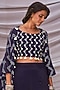Featuring a navy blue cape in silk base with bandhani pattern. It is paired with a matching crepe crop top having mirror and tassel embroidery and flared pants.