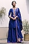 Featuring a royal blue kurta in silk base with peacock embroidery. It is paired with a sharara and a dupatta having sequins detailing. Style it with soft curls, potli and stackable bangles, finished with juttis or metallic heels for a festive touch or wedding ceremony.