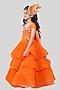 Featuring an orange tiered ruffled ball gown for girls in net, cotton and butter crepe base with asymmetrical pleats and crystal brooch embellishments . Style this outfit with sandals and a cute hair accessory for any festive occasion.