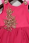 Featuring a pink high-low ball gown in net and scuba base with golden kirkiri on the chest.