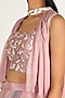 Featuring a blush pink dhoti skirt in raw silk, shantoon, crepe and tabby silk base with embellishment. It is paired with a blouse and jacket. Style it with dangler earrings and heels for a complete look.