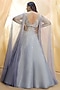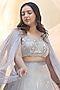Featuring a cashmere blue lehenga in dupion silk base with hand embroidery. It is paired with a matching blouse having an attached net drape.