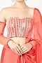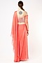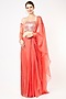 Featuring a coral pre-draped saree in satin organza, dupion, and net base. It is paired with an embroidered blouse and detachable sleeves. Accentuate it with statement jewellery and heels for a wedding, engagement or sangeet ceremony.