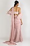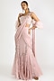 Featuring a dusty pink off shoulder blouse in dupion, tabi silk, and chiffon base with cutdana embroidery. It is paired with a matching saree.