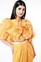 Featuring a mustard ruffled top in crepe and organza base with sequins embroidery. It is paired with a matching dhoti.