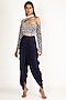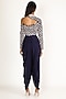 Featuring a navy blue blouse in dupion, tabby silk and crepe base with embroidery. It is paired with matching dhoti pants.