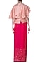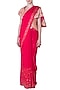 Featuring a old rose red saree in raw silk base with 3D rose gold handwork embroidery. It is paired with a matching pink asymmetrical jacket blouse in crepe base.