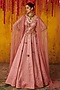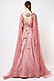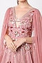 Featuring an onion pink cut-out gown in satin organza base with attached net draped sleeves and embroidery.