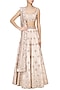 This set features a pink blouse in silk base with rose gold jaal embroidery on the front and back. It is paired with matching lehenga in silk with floral embroidered bootis all over along with pink organza dupatta with heavy embroidered border.