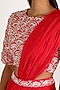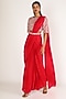 Featuring a red saree in dupion, shantoon, tabby silk, and crepe base with pleats and embroidery. It is paired with a matching blouse.