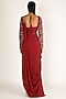 Featuring a red saree in dupion, shantoon and crepe base with embroidery. It is paired with a matching blouse.