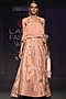 Featuring a rose pink lehenga skirt in dupion and chiffon base with rose gold hexagon embroidery. It is paired with a matching roughed blouse.