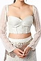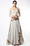 Featuring a sage green lehenga in organza, dupion, and shantoon base. It is paired with a matching corset blouse.