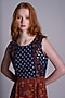 Featuring a blue and red dress in crepe and denim base with floral embroidery and digital print .