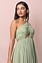 Featuring a pistachio green gown in georgette and tulle base with hand embroidery and a drape.