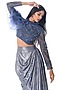 Featuring an indigo ruffled crop top in tulle and organza base with embroidery. It is paired with a matching shimmer crepe cowl skirt.