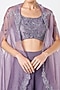 Featuring a purple cape in pure organza base with embroidery. It is paired with a matching pure chanderi crop top and pure georgette layered palazzo pants.