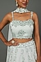 Featuring a sky blue layered lehenga in satin, chiffon, and crepe base. It is paired with a matching strappy crop top having net detailing and a dupatta.
