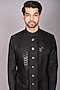 Featuring a black indo-western jacket in blended fabric base with thread and sequins machine embroidery. It is paired with pants. Perfect wear for engagement or wedding ceremony.