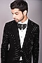 Featuring a jet black tuxedo jacket in japanese polynosic base with cutdana hand embroidery. It is paired with trousers, a white cotton pintuck bow collar shirt and a bowtie. Perfect wear for engagement or wedding ceremony.