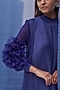 Featuring a blue high neck dress in pleated polyester base with flower detailing.